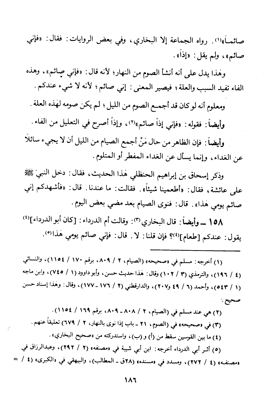 158 - وأيضاً: قال البخاري: وقالت أم الدرداء: [كان أبو الدرداء] قول: عندكم [طعام]؟ فإن قلنا: لا. قال: فإني صائم يومي هذا.