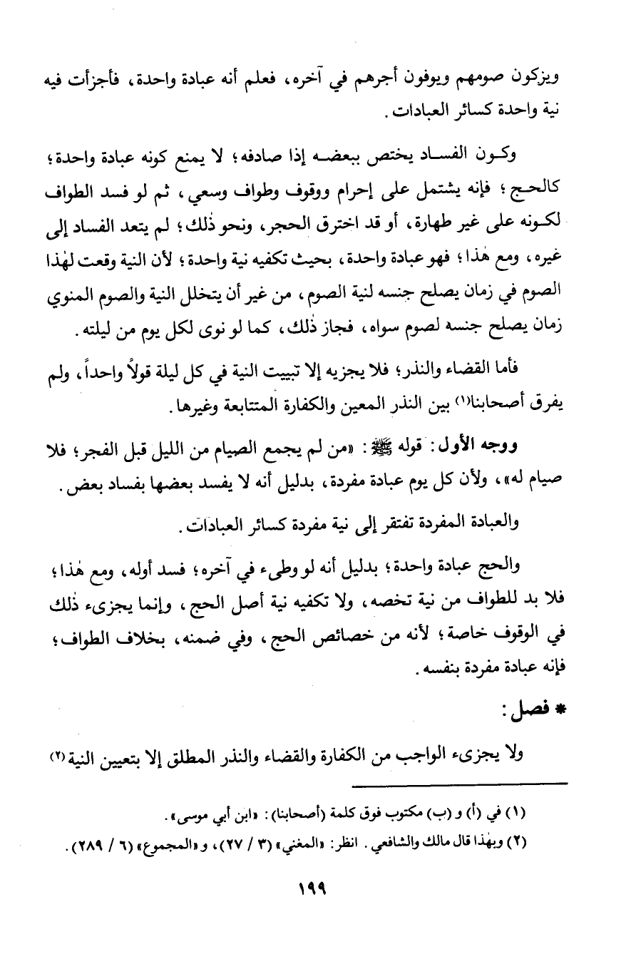 وكون الفساد يختص ببعضه إذا صادفه؛ لا يمنع كونه عبادة واحدة؛ كالحج؛ فإنه يشتمل على إحرام ووقوف وطواف وسعي, ثم لو فسد الطواف لكونه على غير طهارة, أو قد اخترق الحجر, ونحو ذلك لم يتعد الفساد إلى غيره, ومع هذا؛ فهو عبادة واحدة, بحيث تكفيه نية واحدة؛ لأن النية وقعت لهذا الصوم في زمان يصلح جنسه لنية الصوم, من غير أن يتخلل النية والصوم المنوي زمان يصلح جنسه لصوم سواه, فجاز ذلك, كما لو نوى لكل يوم من ليلته.
