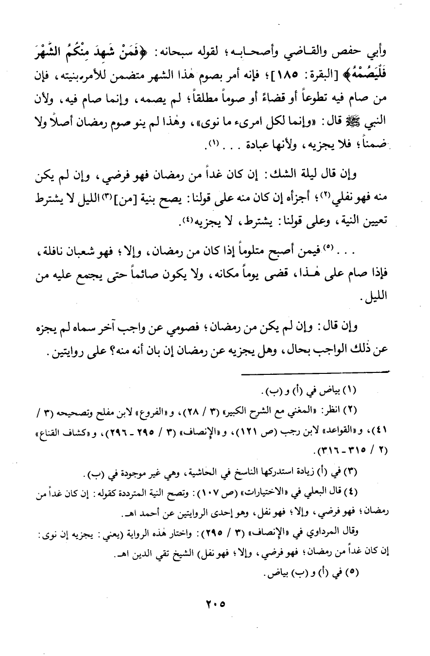 وأبي حفص والقاضي وأصحابه؛ لقوله سبحانه: {فَمَنْ شَهِدَ مِنْكُمُ الشَّهْرَ فَلْيَصُمْهُ} [البقرة: 185]؛ فإنه أمر بصوم هذا الشهر متضمن للأمر بنيته, فإن من صام فيه تطوعاً أو قضاءً أو صوماً مطلقاً؛ لم يصمه, وإنما صام فيه, ولأن النبي صلى الله عليه وسلم قال: «وإنما لكل امرئ ما نوى» , وهذا لم ينو صوم رمضان أصلاً ولا ضمناً؛ فلا يجزيه, ولأنها عبادة. . . .