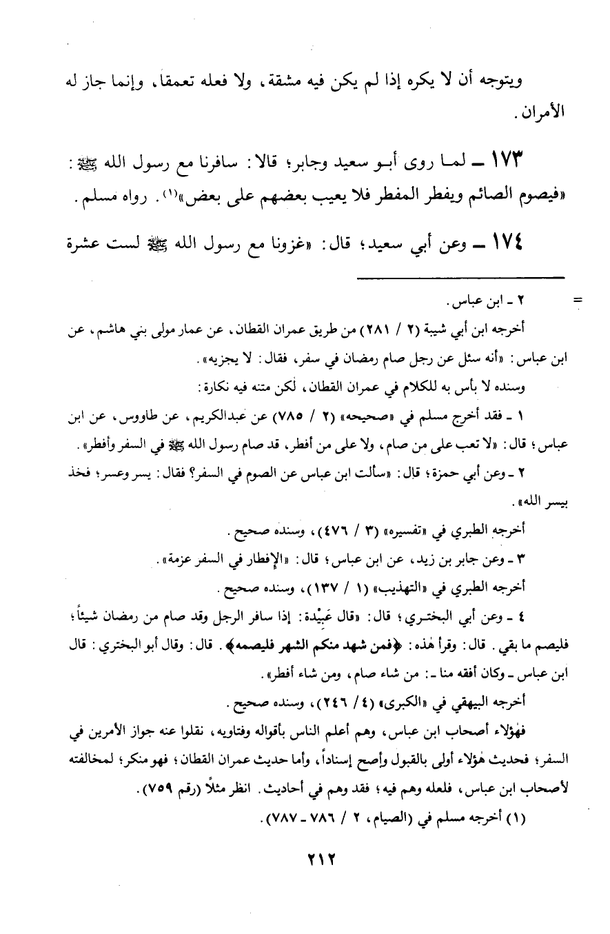 173 - لما روى أبو سعيد وجابر؛ قالا: سافرنا مع رسول الله صلى الله عليه وسلم: «فيصوم الصائم ويفطر المفطر فلا يعيب بعضهم على بعض». رواه مسلم.