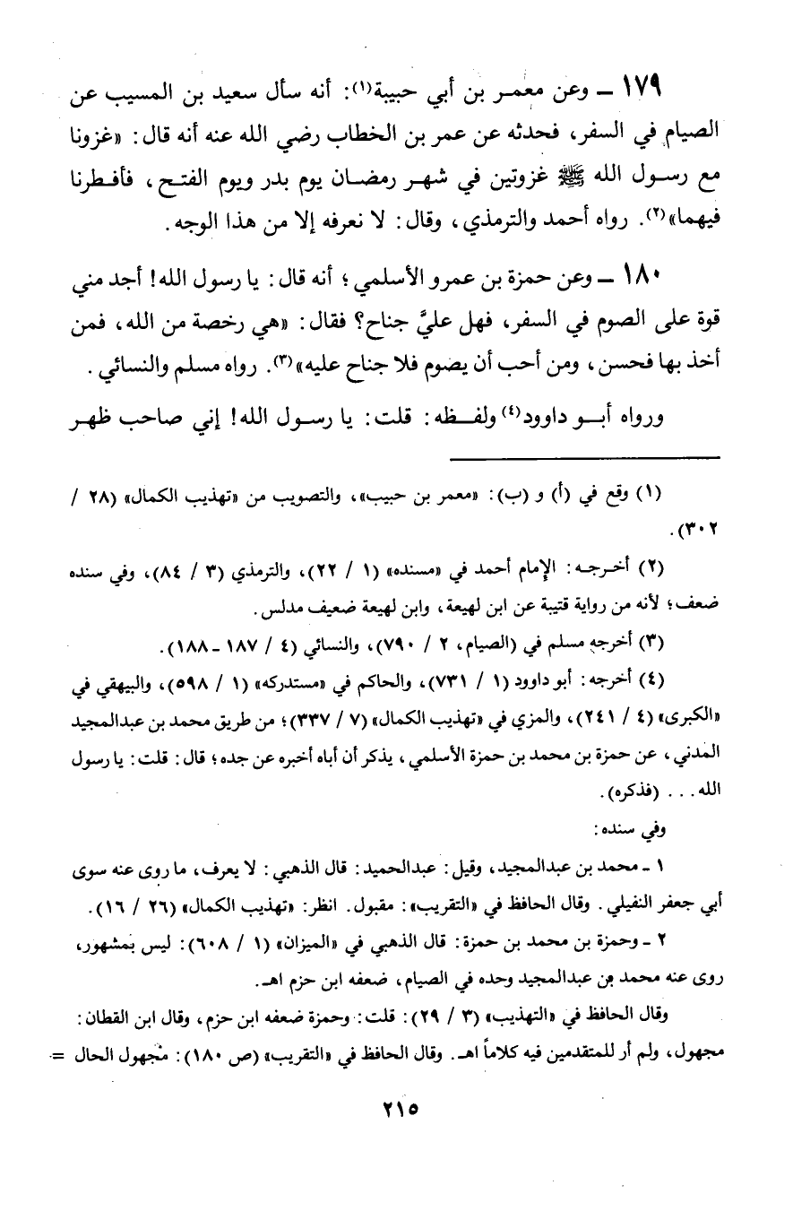 179 - وعن معمر بن أبي حبيبة: أنه سأل سعيد بن المسيب عن الصيام في السفر, فحدثه عن عمر بن الخطاب رضي الله عنه أنه قال: «غزونا مع رسول الله صلى الله عليه وسلم غزوتين في شهر رمضان يوم بدر ويوم الفتح, فأفطرنا فيهما». رواه أحمد والترمذي, وقال: لا نعرفه إلا من هذا الوجه.