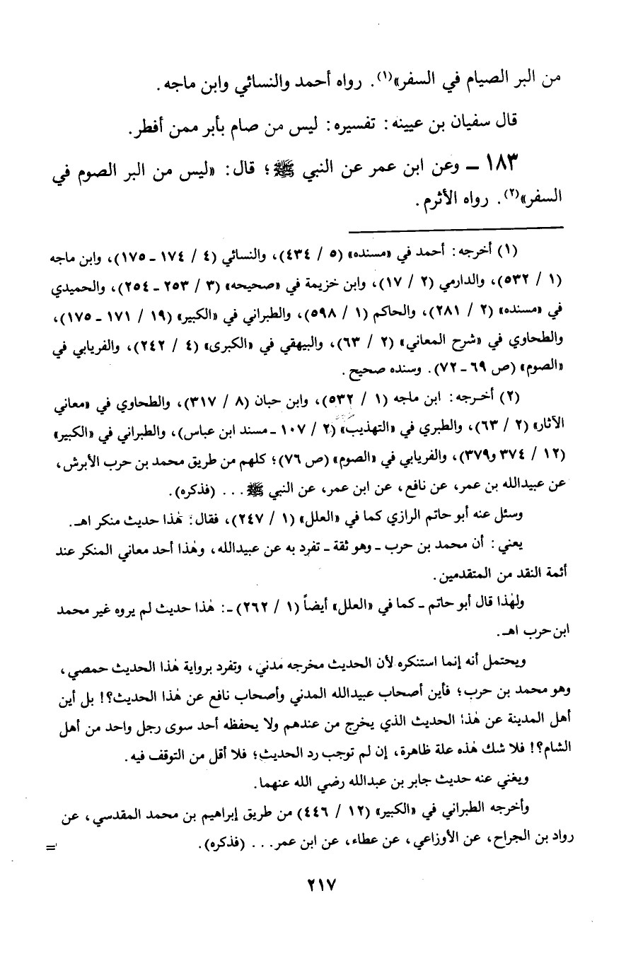 183 - وعن ابن عمر عن النبي صلى الله عليه وسلم؛ قال: «ليس من البر الصوم في السفر». رواه الأثرم.