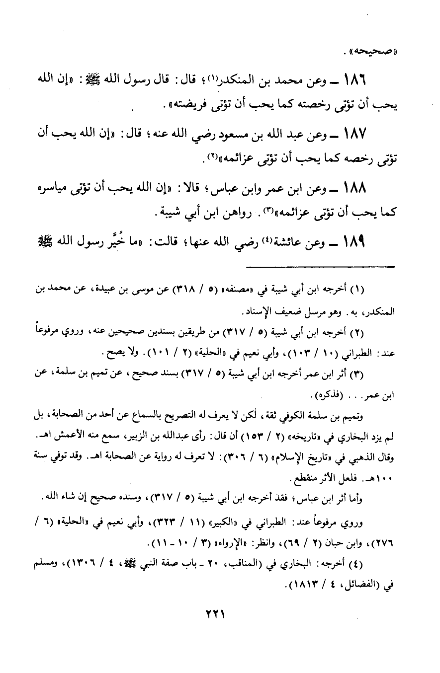 187 - وعن عبد الله بن مسعود رضي الله عنه؛ قال: «إن الله يحب أن تؤتى رخصه كما يحب أن تؤتى عزائمه».