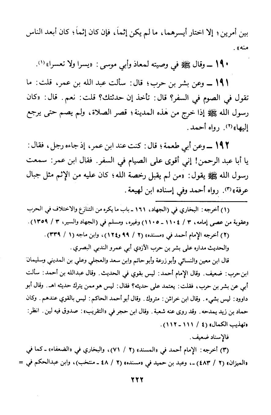 191 - وعن بشر بن حرب؛ قال: سألت عبد الله بن عمر, قلت: ما تقول في الصوم في السفر؟ قال: تأخذ إن حدثتك؟ قلت: نعم. قال: «كان رسول الله صلى الله عليه وسلم إذا خرج من هذه المدينة؛ قصر الصلاة, ولم يصم حتى يرجع إليها». رواه أحمد.