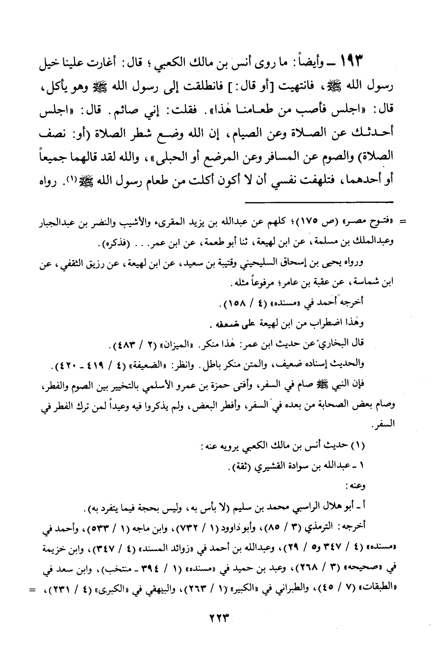 193 - وأيضاً: ما روى أنس بن مالك الكعبي؛ قال: أغارت علينا خيل رسول الله صلى الله عليه وسلم, فانتهيت [أو قال:] فانطلقت إلى رسول الله صلى الله عليه وسلم وهو يأكل, قال: «اجلس فأصب من طعامنا هذا». فقلت: إني صائم. قال: «اجلس أحدثك عن الصلاة وعن الصيام, إن الله وضع شطر الصلاة (أ: نصف الصلاة) والصوم عن المسافر وعن المرضع أو الحبلى» , والله لقد قالهما جميعاً أو احدهما, فتلهفت نفسي أن لا أكون أكلت من طعام رسول الله صلى الله عليه وسلم. رواه