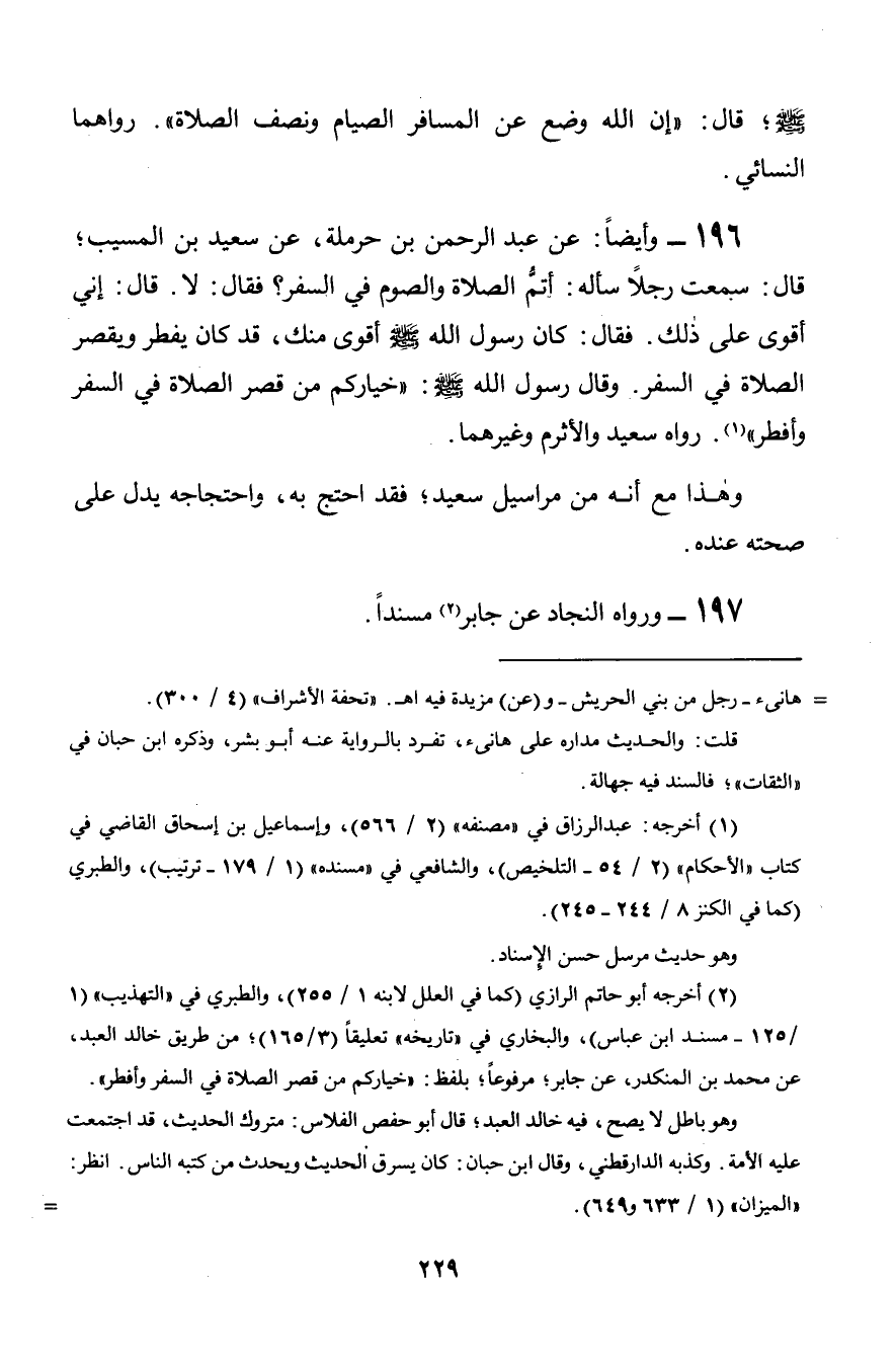 196 - وأيضاً: عن عبد الرحمن بن حرملة, عن سعيد بن المسيب؛ قال: سمعت رجلاً سأله: أتمُّ الصلاة والصوم في السفر؟ فقال: لا. قال: إني أقوى على ذلك. فقال: كان رسول الله صلى الله عليه وسلم أقوى منك, قد كان يفطر ويقصر الصلاة في السفر. وقال رسول الله صلى الله عليه وسلم: «خياركم من قصر الصلاة في السفر وأفطر». رواه سعيد والأثرم وغيرهما.