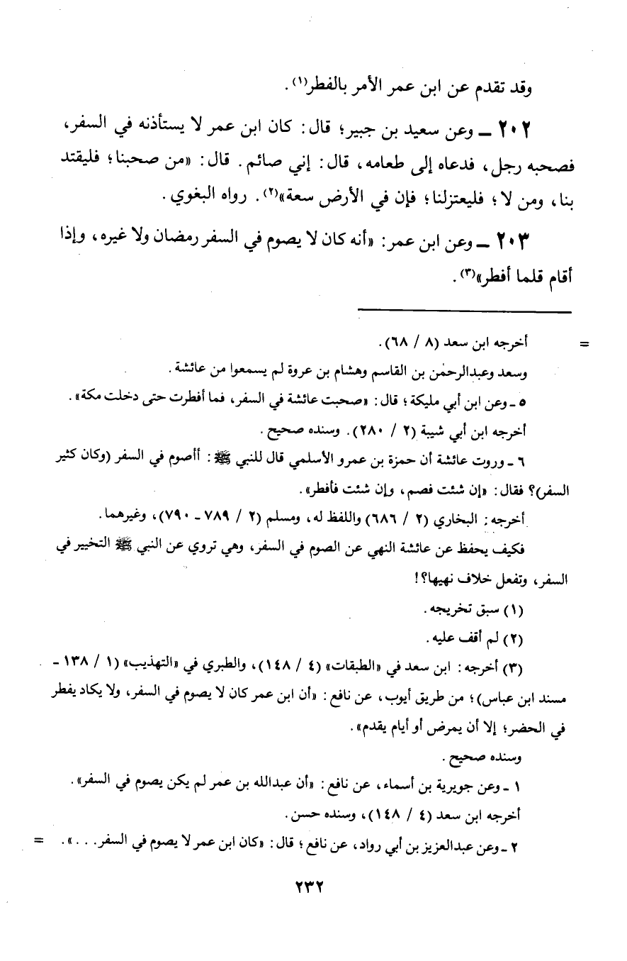 203 - وعن ابن عمر: «أنه كان لا يصوم في السفر رمضان ولا غيره, وإذا أقام قلما فطر».