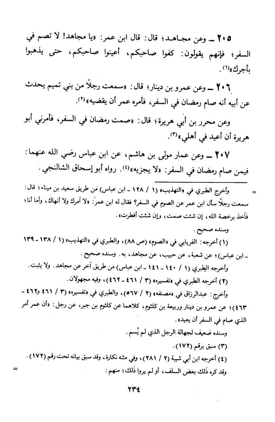 205 - وعن مجاهد؛ قال: قال ابن عمر: «يا مجاهد! لا تصم في السفر؛ فإنهم يقولون: كفوا صاحبكم, أعينوا صاحبكم, حتى يذهبوا بأجرك».