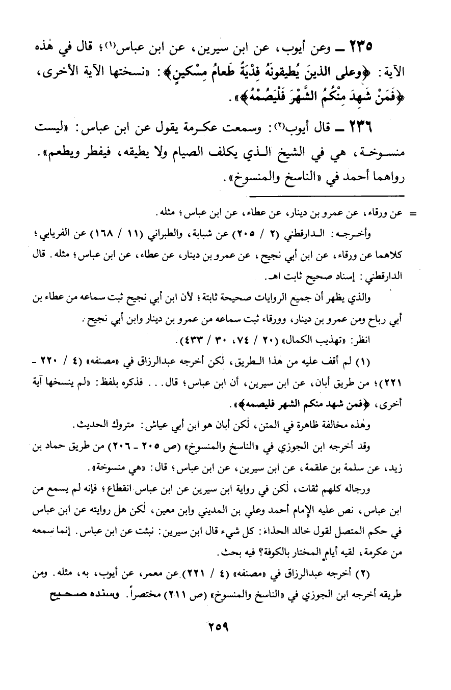 236 - قال أيوب: وسمعت عكرمة يقول ابن عباس: «ليست منسوخة, هي في الشيخ الذي يكلف الصيام ولا يطيقه, فيفطر ويطعم». رواهما أحمد في «الناسخ والمنسوخ».