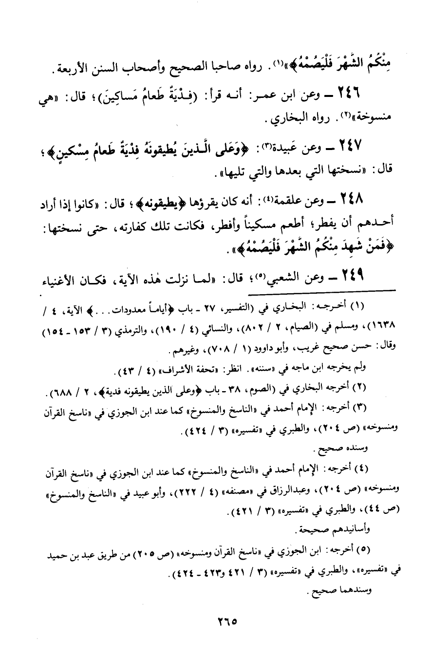 248 - وعن علقمة: أنه كان يقرؤها {يُطِيقُونَهُ}؛ قال: «كانوا إذا أراد أحدهم أن يفطر؛ أطعم مسكيناً وأفطر, فكانت تلك كفارته, حتى نسختها: {فَمَنْ شَهِدَ مِنْكُمُ الشَّهْرَ فَلْيَصُمْهُ}».
