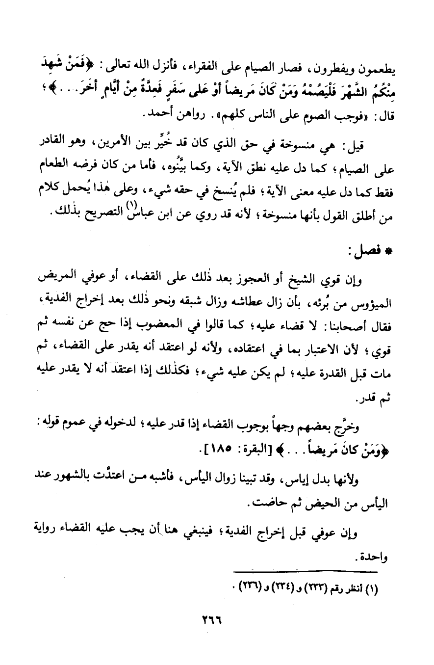 يطعمون ويفطرون, فصار الصيام على الفقراء, فأنزل الله تعالى: {فَمَنْ شَهِدَ مِنْكُمُ الشَّهْرَ فَلْيَصُمْهُ وَمَنْ كَانَ مَرِيضًا أَوْ عَلَى سَفَرٍ فَعِدَّةٌ مِنْ أَيَّامٍ أُخَرَ. . .}؛ قال: «فوجب الصوم على الناس كلهم». رواهن أحمد.