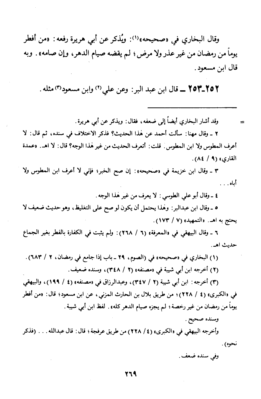 وقال البخاري في «صحيحه»: ويُذكر عن أبي هريرة رفعه: «من أفطر يوماً من رمضان من غير عذر ولا مرض؛ لم يقضه صيام الدهر, وإن صامه». وبعه قال ابن مسعود.