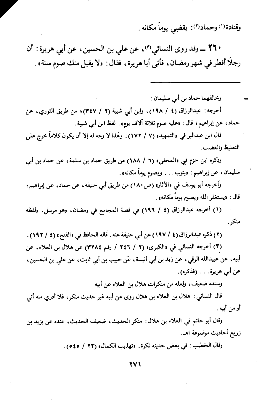 260 - وقد روى النسائي, عن علي بن الحسين, عن أبي هريرة: أن رجلاً أفطر في شهر رمضان, فأتى أبا هريرة, فقال: «لا يقبل منك صوم سنة».