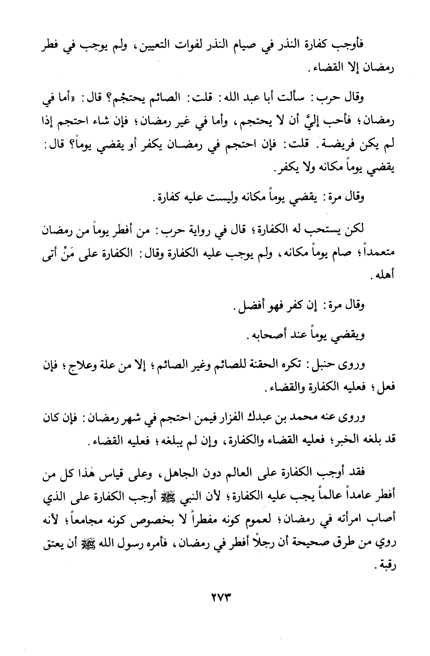 وقال حرب: سألت أبا عبد الله: قلت: الصائم يحتجم؟ قال: «أما في رمضان؛ فأحب إليَّ أن لا يحتجم, وأما في غير رمضان؛ فإن شاء احتجم إذا لم يكن فريضة. قلت: فإن احتجم في رمضان يكفر أو يقضي يوماً؟ قال: يقضي يوماً مكانه ولا يكفر.