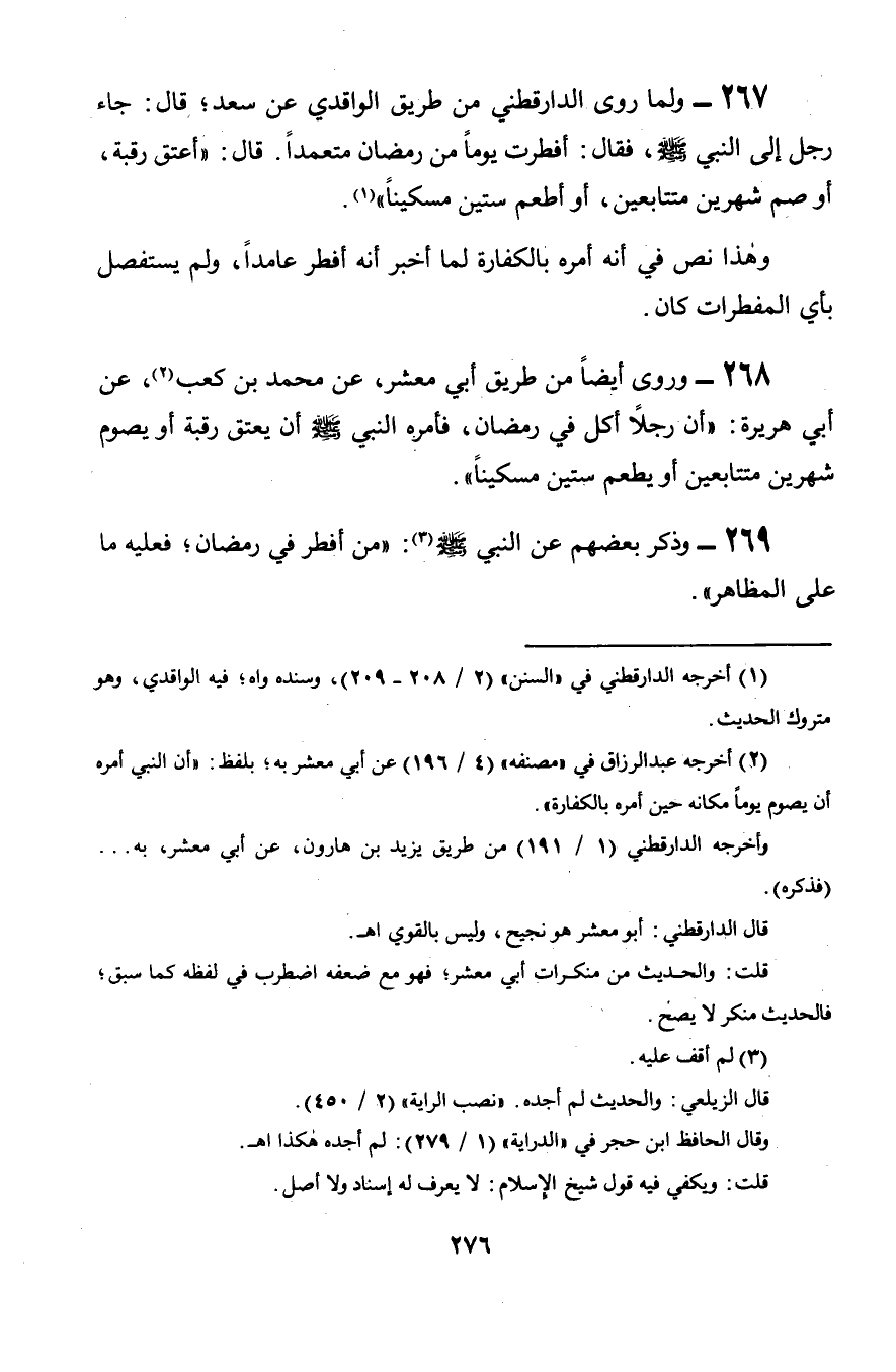 267 - ولما روى الدارقطني من طريق الواقدي عن سعد؛ قال: جاء رجل إلى النبي صلى الله عليه وسلم, فقال: أفطرت يوماً من رمضان متعمداً. قال: «اعتق رقبة, أو صم شهرين متتابعين, أو أطعم ستين مسكيناً».