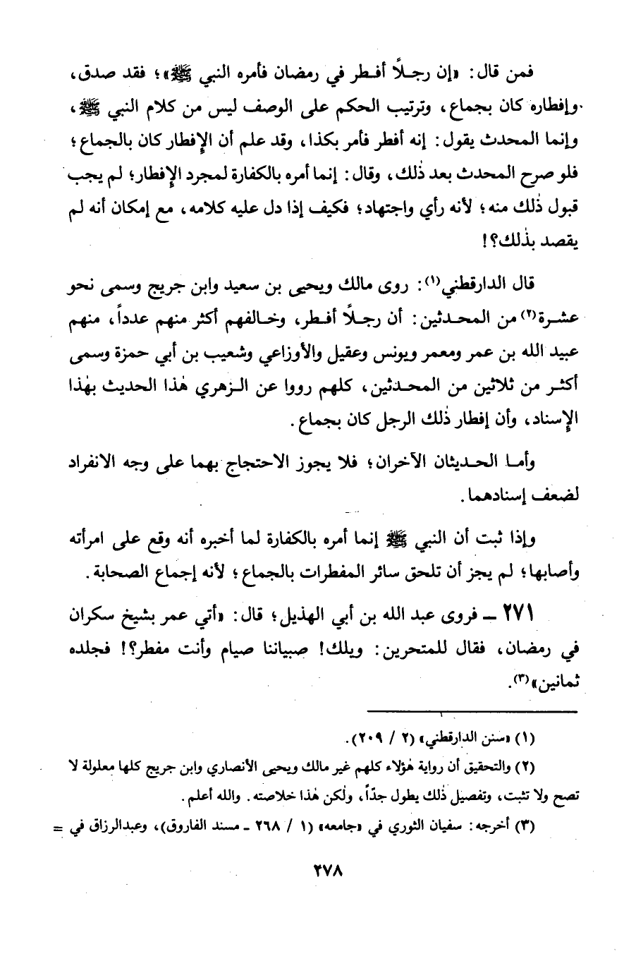 قال الدارقطني: روى مالك ويحيى بن سعيد وابن جريج وسمى نحو عشرة من المحدثين: أن رجلاً أفطر, وخالفهم أكثر منهم عدداً, منهم عبيد الله بن عمر ومعمر ويونس وعقيل والأوزاعي وشعيب بن أبي حمزة وسمى أكثر من ثلاثين من المحدثين, كلهم رووا عن الزهري هذا الحديث بهذا الإِسناد, وأن إفطار ذلك الرجل كان بجماع.