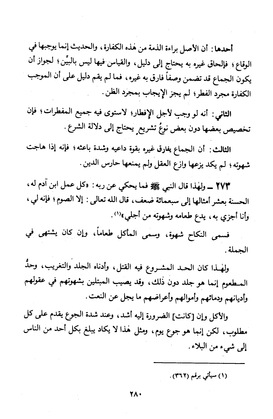 273 - ولهذا قال النبي صلى الله عليه وسلم فما يحكى عن ربه: «كل عمل ابن آدم له, الحسنة بعشر أمثالها إلى سبعمائة ضعف, قال الله تعالى: إلا الصوم؛ فإنه لي, وأنا أجزي به, يدع طعامه وشهوته من أجلي.