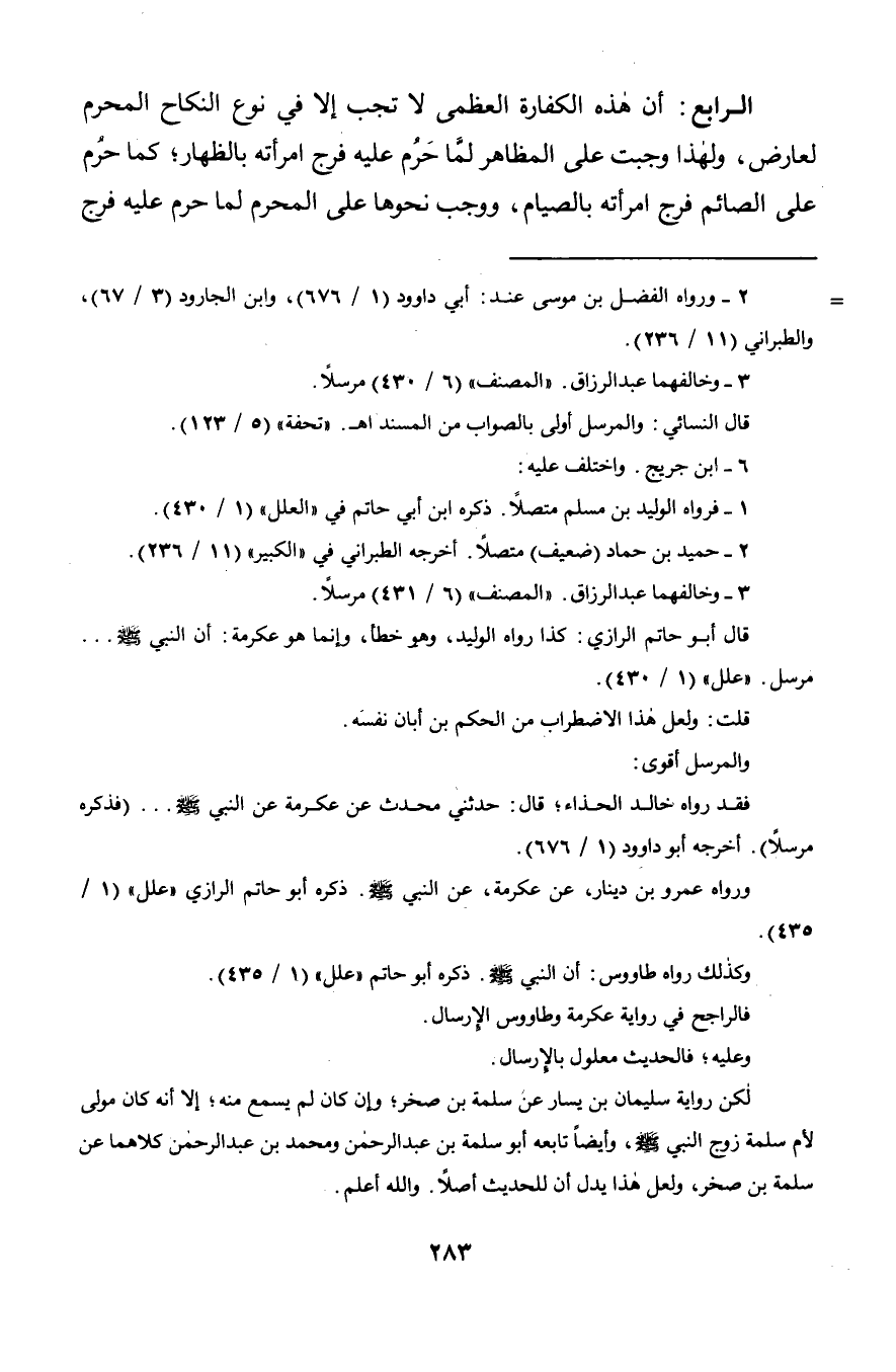الرابع: أن هذه الكفارة العظمى لا تجب إلا في نوع النكاح المحرم لعارض, ولهذا وجبت على المظاهر لمَّا حَرُم عليه فرج امرأته بالظهار؛ كما حُرم على الصائم فرج امرأته بالصيام, ووجب نحوها على المحرم لما حرم عليه فرج