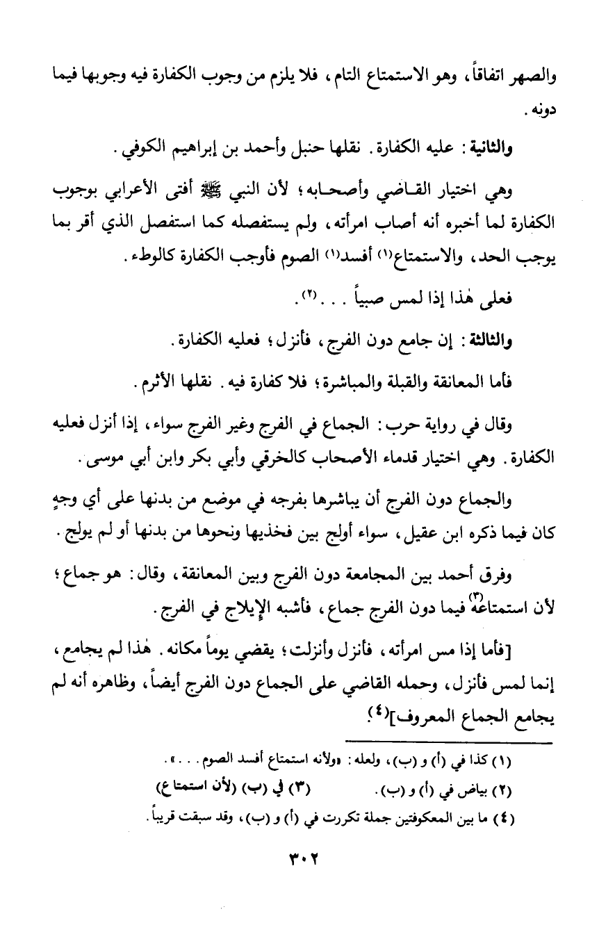 وقال في رواية حرب: الجماع في الفرج وغير الفرج سواء, إذا أنزل فعليه الكفارة. وهي اختيار قدماء الأصحاب كالخرقي وأبي بكر وابن موسى.