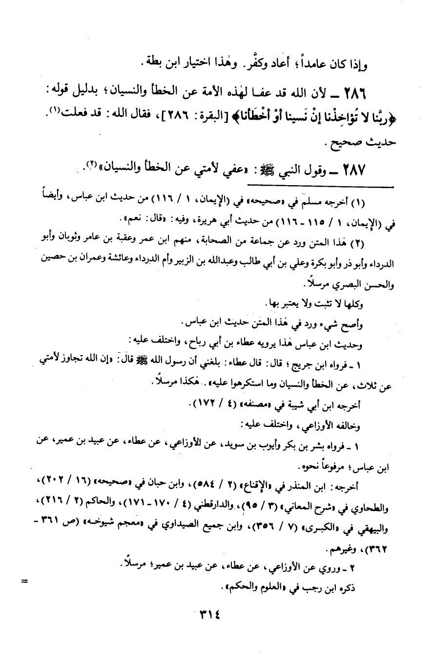 287 - وقول النبي صلى الله عليه وسلم: «عفي لأمتي عن الخطأ والنسيان».