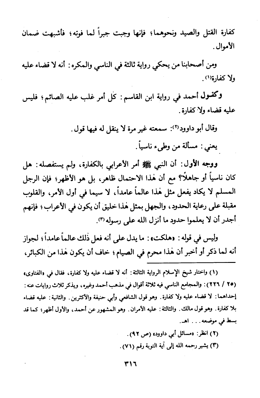 ووجه الأول: أن النبي صلى الله عليه وسلم أمر الأعرابي بالكفارة, ولم يستفصله: هل كان ناسياً أو جاهلاً؟ مع أن هذا الاحتمال ظاهر, بل هو الأظهر؛ فإن الرجل المسلم لا يكاد يفعل مثل هذا عالماً عامداً, لا سيما في أول الأمر, والقلوب مقبلة على رعاية الحدود, والجهل بمثل هذا خليق أن يكون في الأعراب؛ فإنهم أجدر أن لا يعلموا حدود ما أنزل الله على رسوله.