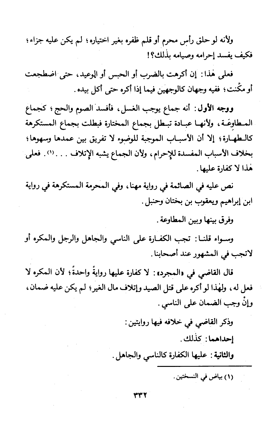 ووجه الأول: أنه جماع يوجب الغسل, فأفسد الصوم والحج؛ كجماع المطاوِعَة, ولأنها عبادة تبطل بجماع المختارة فبطلت بجماع المستكرهة كالطهارة؛ إلا أن الأسباب الموجبة للوضوء لا تفريق بين عمدها وسهوها؛ بخلاف الأسباب المفسدة للإِحرام, ولأن الجماع يشبه الإِتلاف. . . . فعلى هذا لا كفارة عليها.