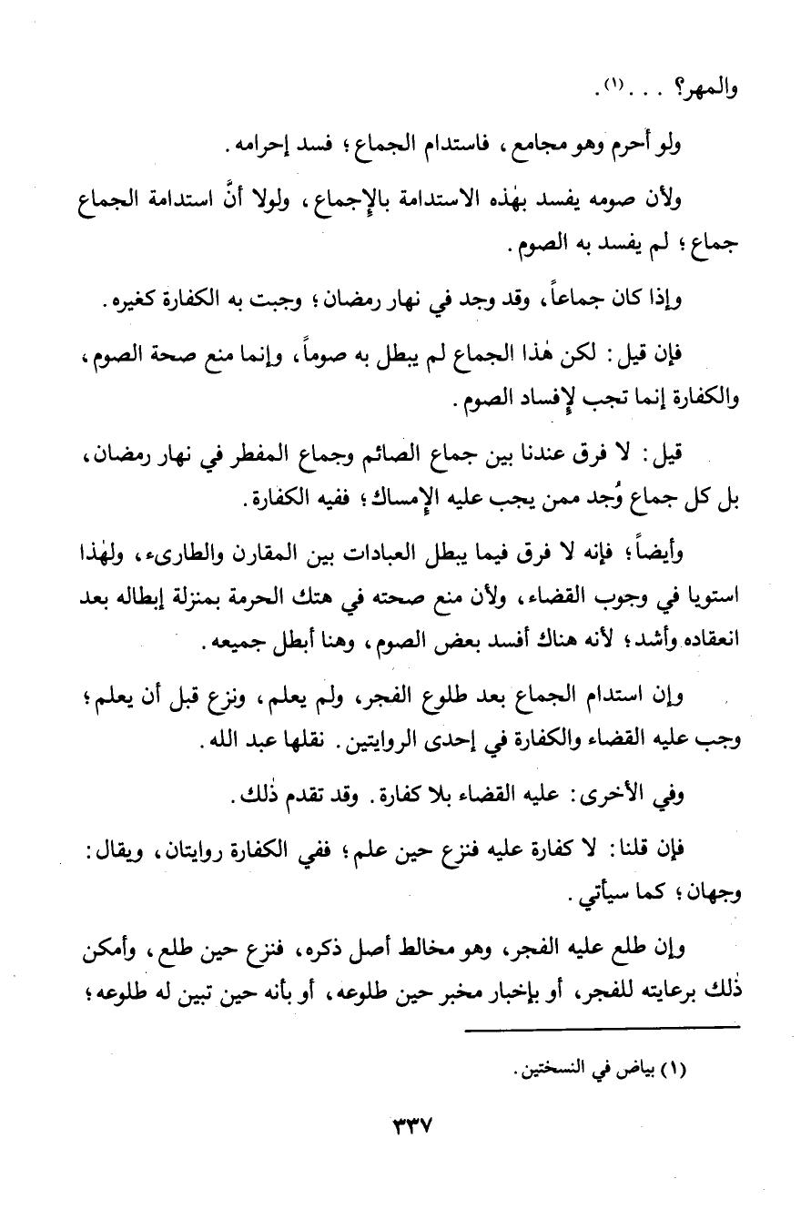 وإن استدام الجماع بعد طلوع الفجر, ولم يعلم, ونزع قبل أن يعلم؛ وجب عليه القضاء والكفارة في إحدى الروايتين. نقلها عبد الله.