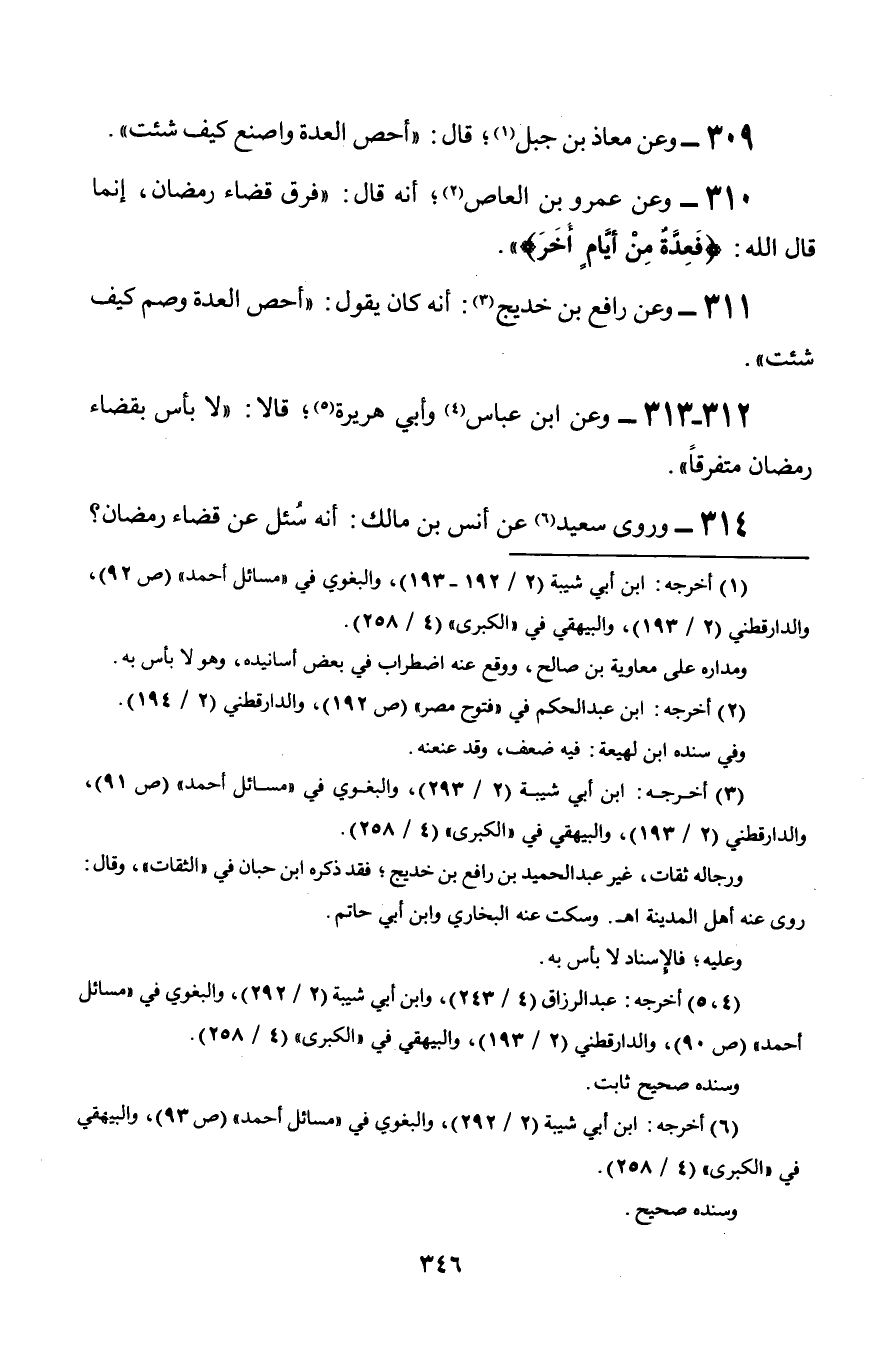 310 - وعن عمرو بن العاص؛ أنه قال: «فرق قضاء رمضان, إنما قال الله: {فَعِدَّةٌ مِنْ أَيَّامٍ أُخَرَ}».