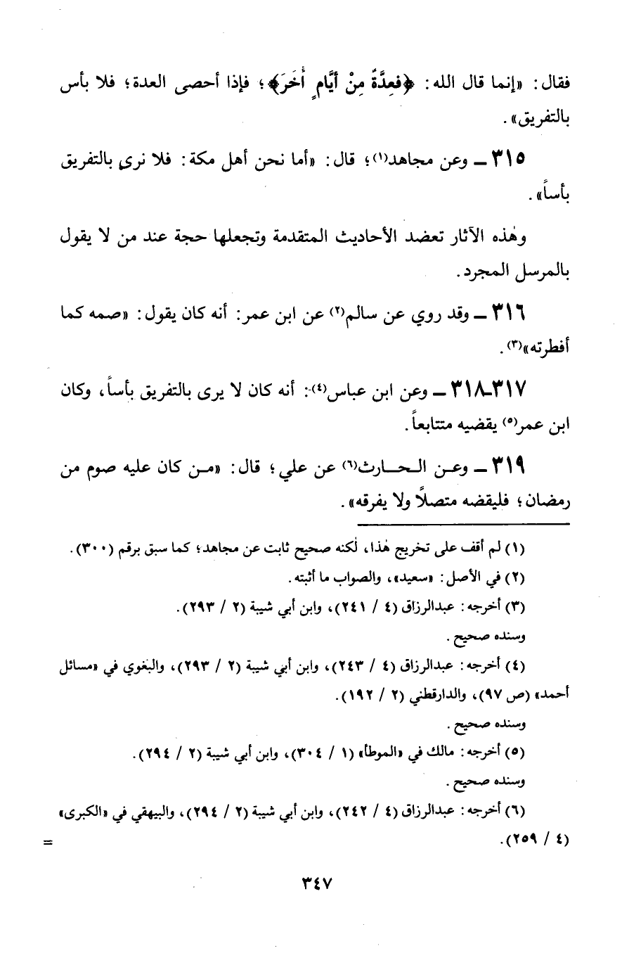 315 - وعن مجاهد؛ قال: «أما نحن أهل مكة: فلا نرى بالتفريق بأساً».