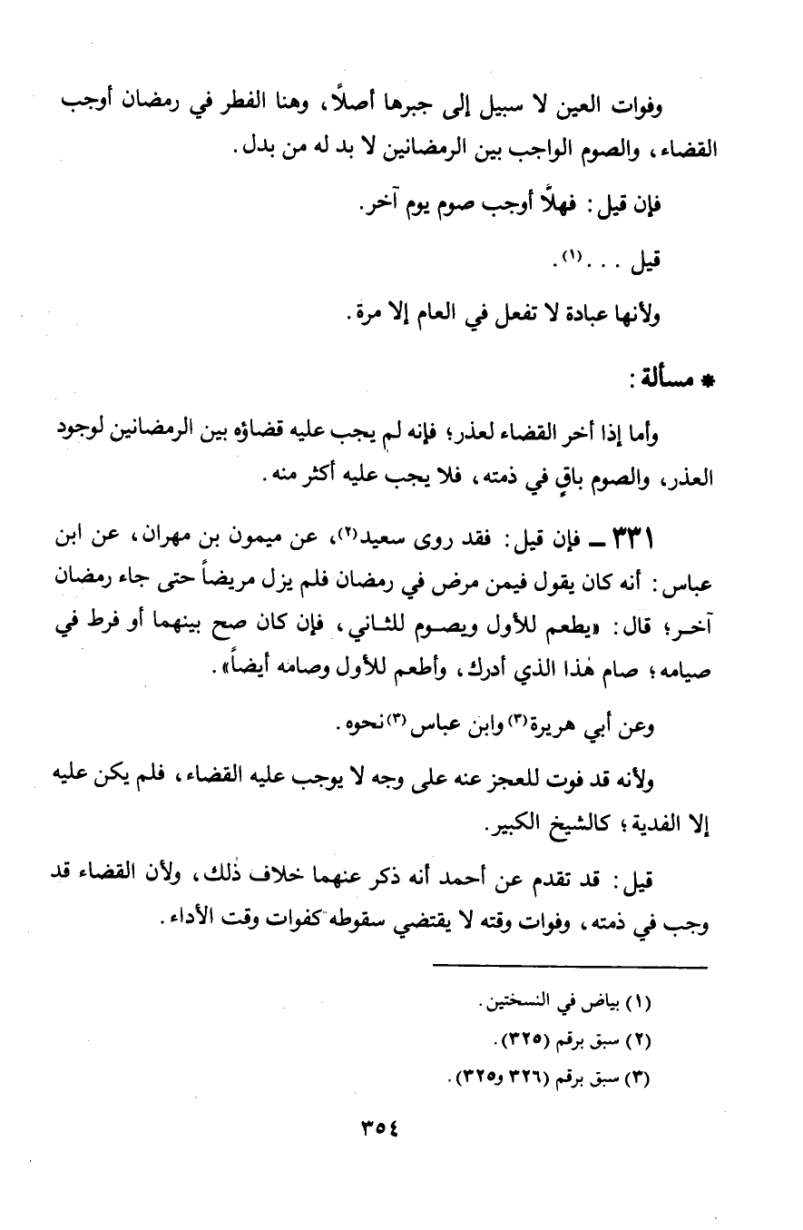 331 - فإن قيل: فقد روى سعيد, عن ميمون بن مهران, عن ابن عباس: أنه كان يقول فيمن مرض في رمضان فلم يزل مريضاً حتى جاء رمضان آخر؛ قال: «يطعم للأول ويصوم للثاني, فإن كان صح بينهما أو فرط في صيامه؛ صام هذا الذي أدرك, وأطعم للأول وصامه أيضاً».