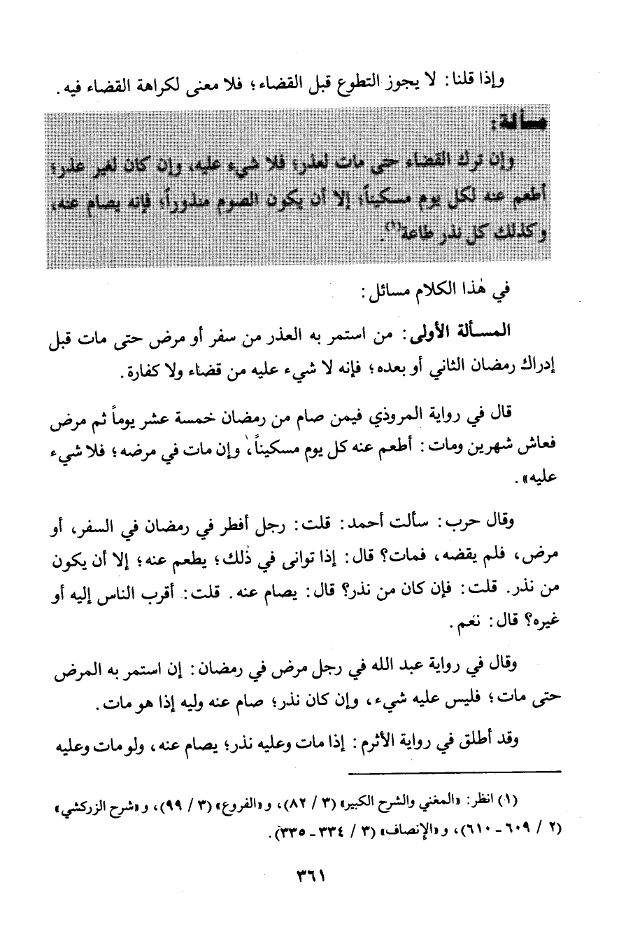 المسألة الأولى: من استمر به العذر من سفر أو مرض حتى مات قبل إدراك رمضان الثاني أو بعده؛ فإنه لا شيء عليه من قضاء ولا كفارة.