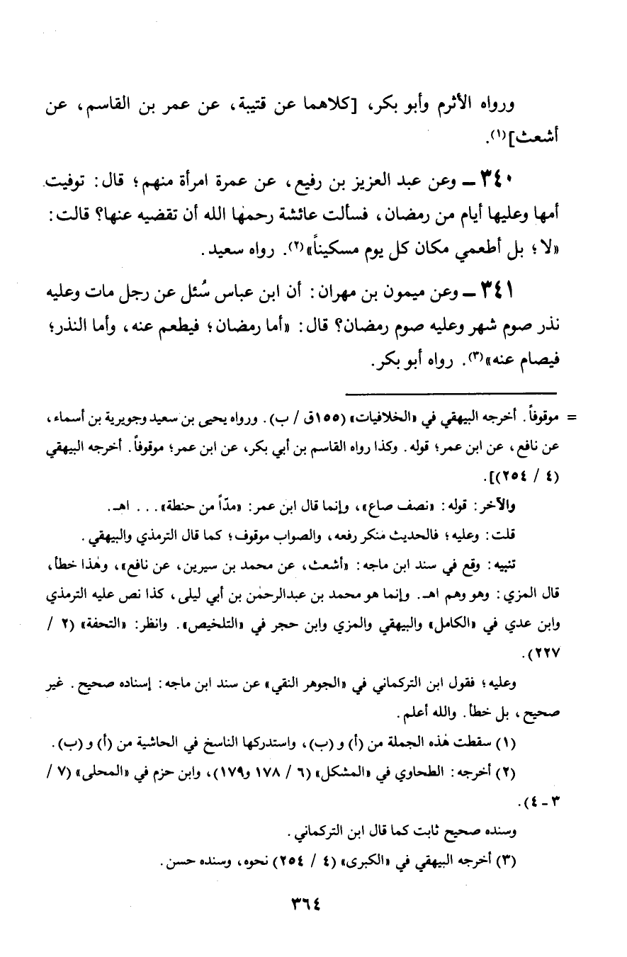341 - وعن ميمون بن مهران: أن ابن عباس سُئل عن رجل مات وعليه نذر صوم شهر وعليه صوم رمضان؟ قال: «أما رمضان؛ فيطعم عنه, وأما النذر؛ فيصام عنه». رواه أبو بكر.