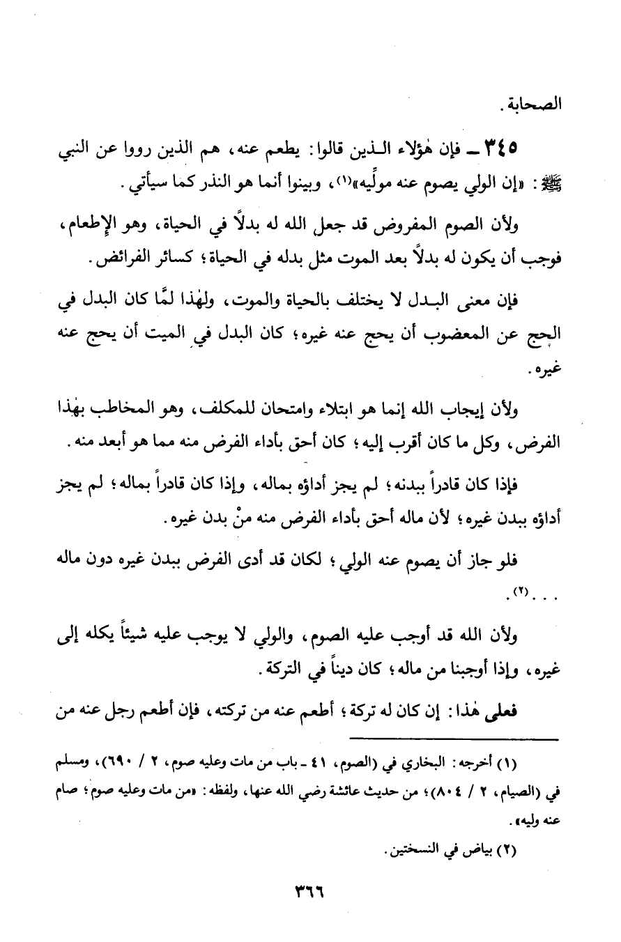 345 - فإن هؤلاء الذين قالوا: يطعم عنه, هم الذين رووا عن النبي صلى الله عليه وسلم: «إن الولي يصوم عنه مولِّيه» , وبينوا أنما هو النذر كما سيأتي.