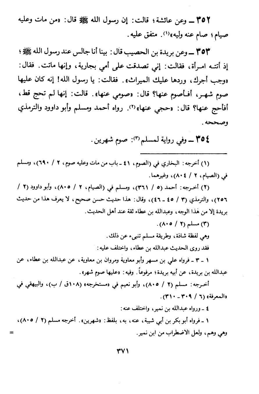 352 - وعن عائشة؛ قالت: إن رسول الله صلى الله عليه وسلم قال: «من مات وعليه صيام؛ صام عنه وليه». متفق عليه.