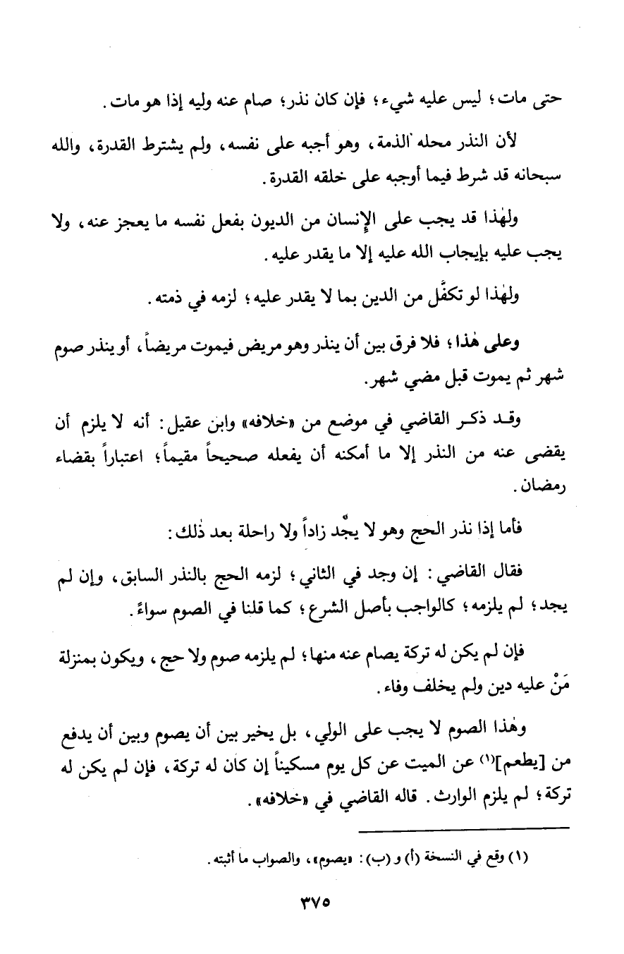 وقد ذكر القاضي في موقع من «خلافه» وابن عقيل: أنه لا يلزم أن يقضي عنه من النذر إلا ما أمكنه أن يفعله صحيحاً مقيماً؛ اعتباراً بقضاء رمضان.