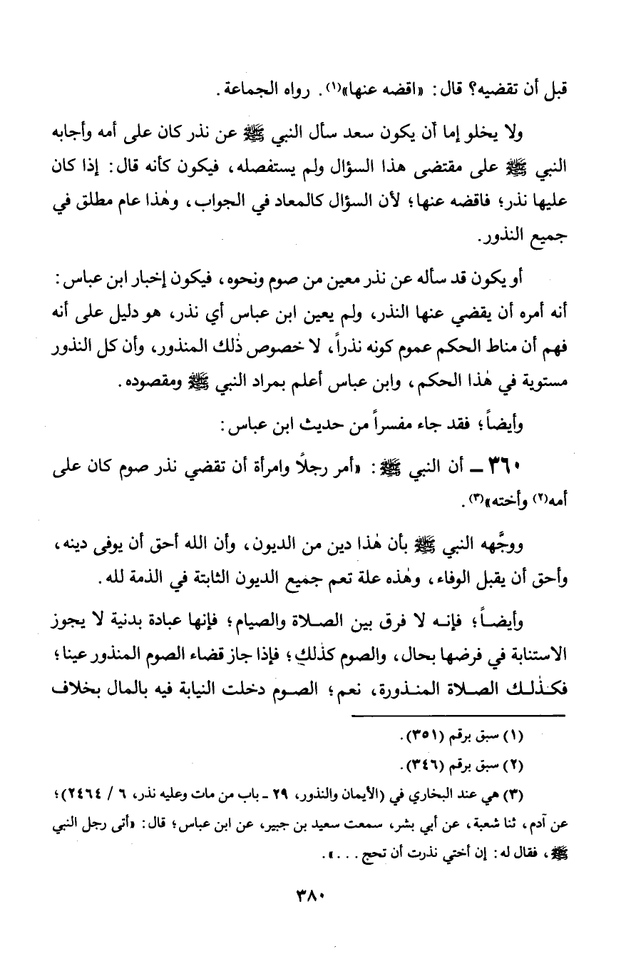 360 - أن النبي صلى الله عليه وسلم: «أمر رجلاً وامرأة أن تقضي نذر صوم كان على أمه وأخته».