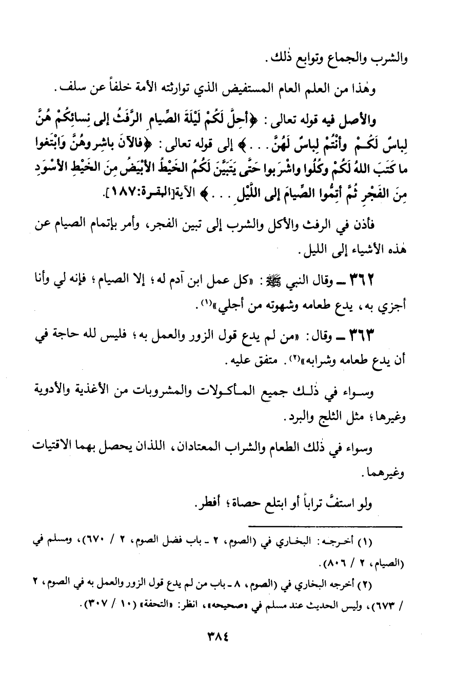 363 - وقال: «من لم يدع قول الزور والعمل به؛ فليس لله حاجة في أن يدع طعامه وشرابه». متفق عليه.