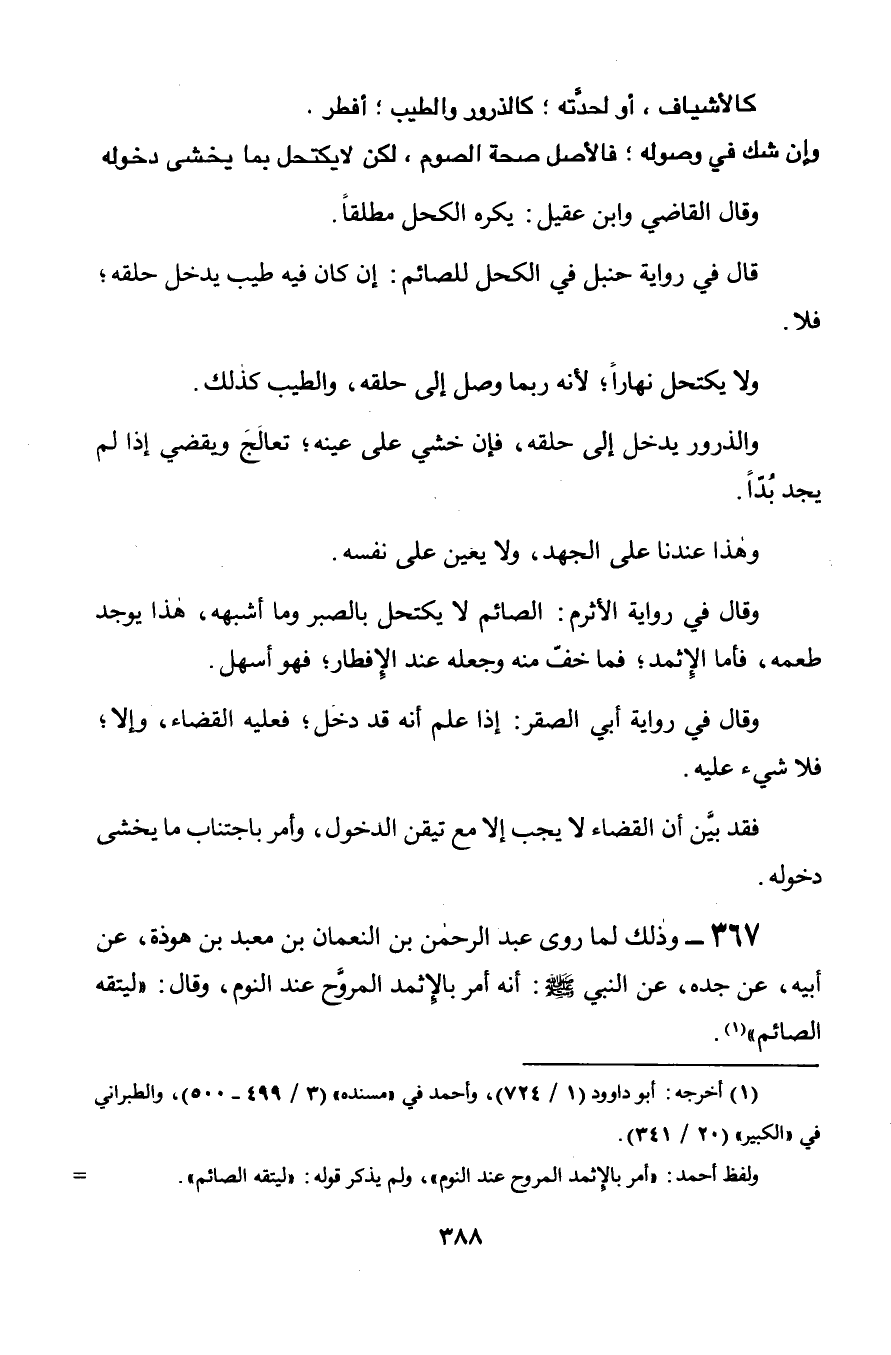 367 - وذلك لما روى عبد الرحمن بن النعمان بن معبد بن هوذة, عن أبيه, عن جده, عن النبي صلى الله عليه وسلم: أنه أمر بالإِثمد المروَّح عند النوم, وقال: «ليتقه الصائم».