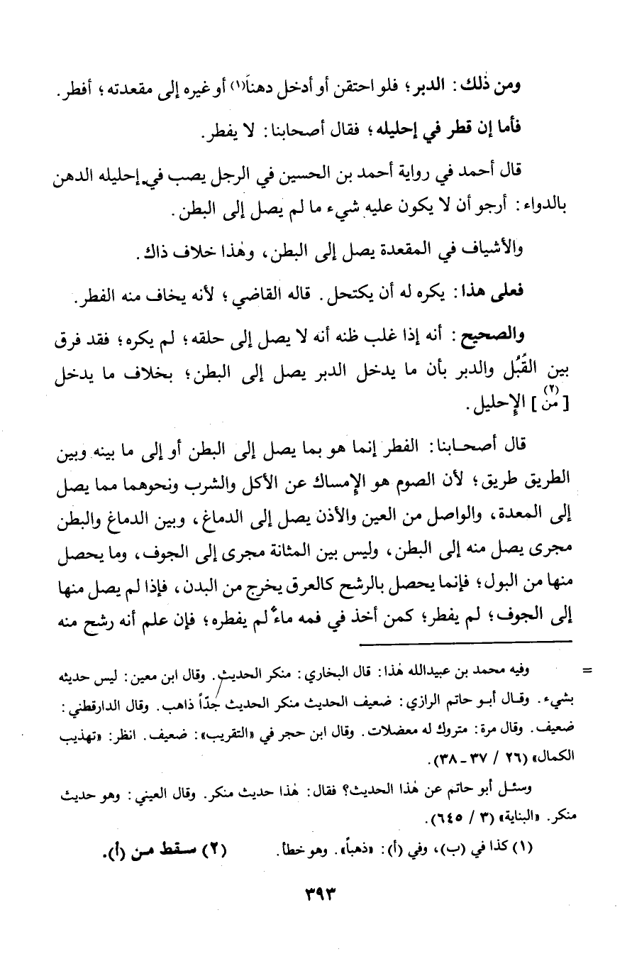 قال أحمد في رواية أحمد بن الحسين في الرجل يصيب في إحليله الدهن بالدواء: أرجو أن لا يكون عليه شيء ما لم يصل إلى البطن.