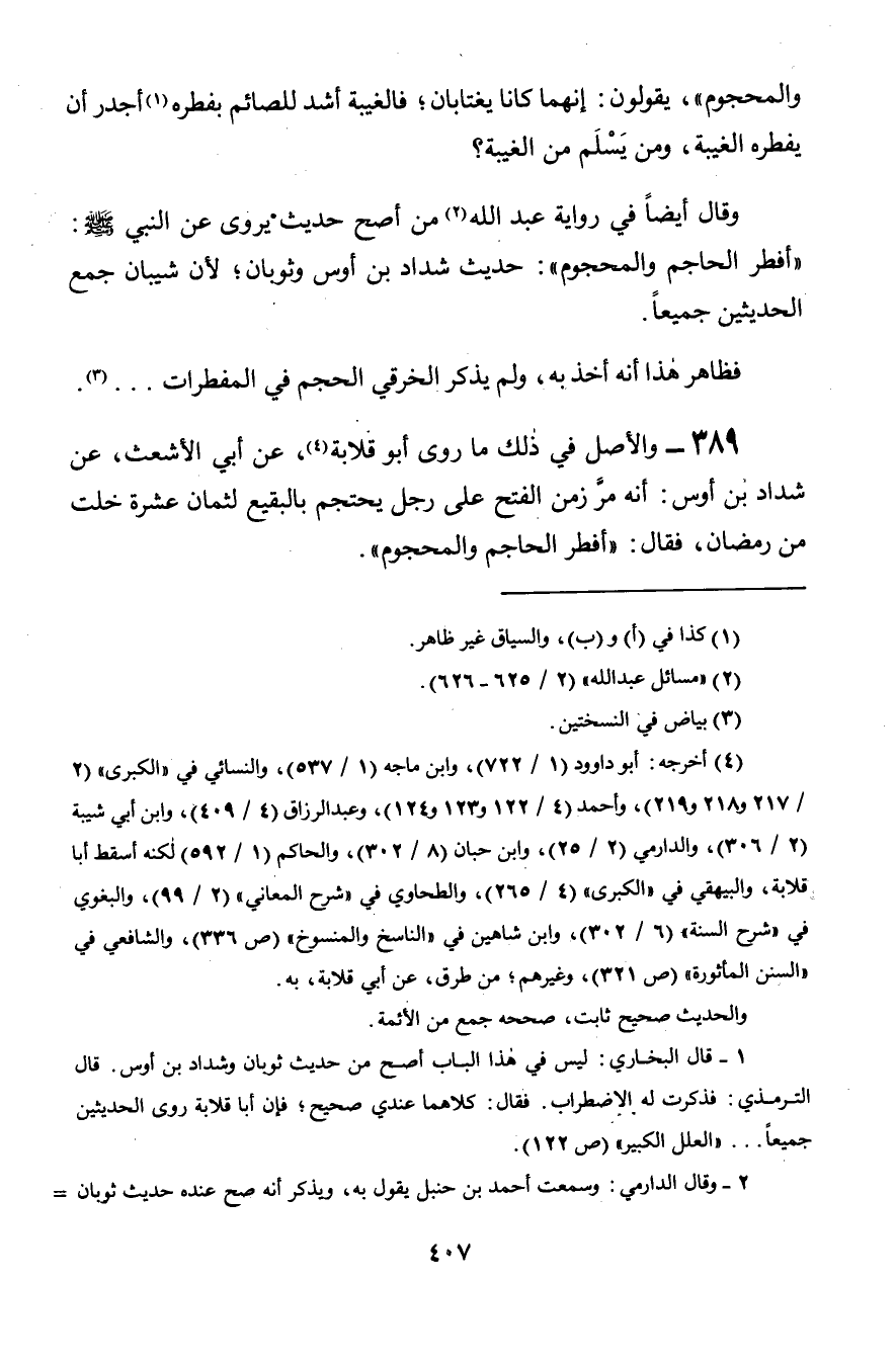 389 - والأصل في ذلك ما روى ابن قلابة, عن أبي الأشعث, عن شداد بن أوس: أنه مرَّ زمن الفتح على رجل يحتجم بالبقيع لثمان عشرة خلت من رمضان, فقال: «أفطر الحاجم والمحجوم».