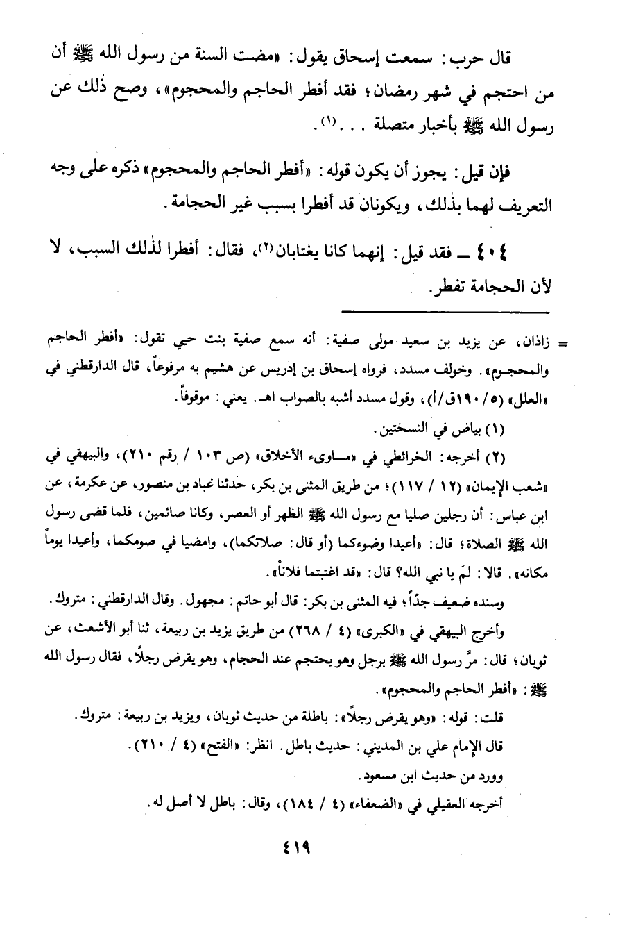 قال حرب: سمعت إسحاق يقول: «مضت السنة من رسول الله صلى الله عليه وسلم من احتجم في شهر رمضان؛ فقد أفطر الحاجم والمحجوم» , وصح ذلك عن رسول الله صلى الله عليه وسلم بأخبار متصلة. . . .