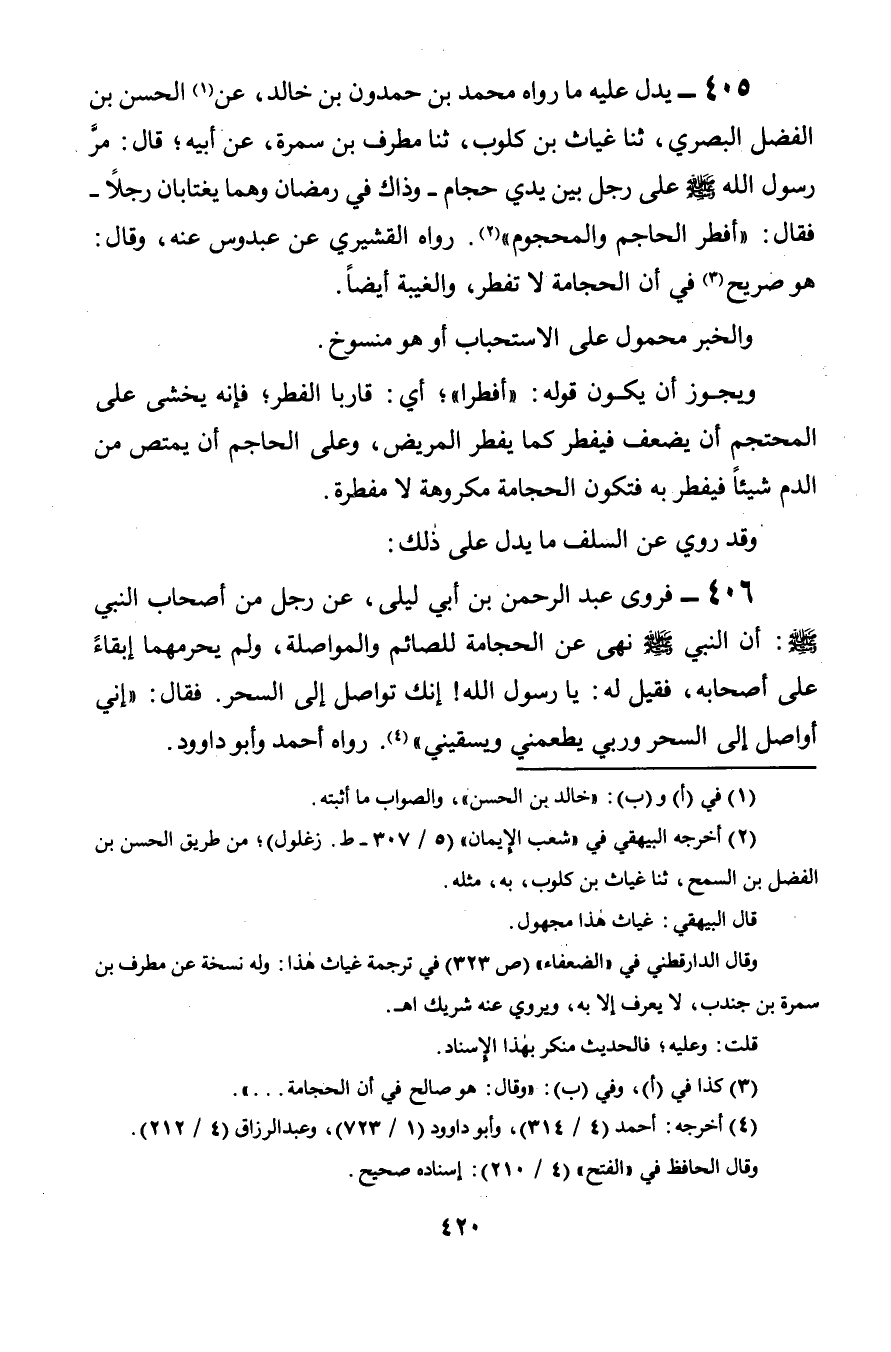405 - يدل عليه ما رواه محمد بن حمدون بن خالد, عن الحسن بن الفضل البصري, ثنا غياث بن كلوب, ثنا مطرف بن سمرة, عن أبيه؛ قال: مرَّ رسول الله صلى الله عليه وسلم على رجل بين يدي حجام – وذاك في رمضان وهما يغتابان رجلاً – فقال: «أفطر الحاجم والمحجوم». رواه القشيري عن عبدوس عنه, وقال: هو صريح في أن الحجامة لا تفطر, والغيبة أيضاً.