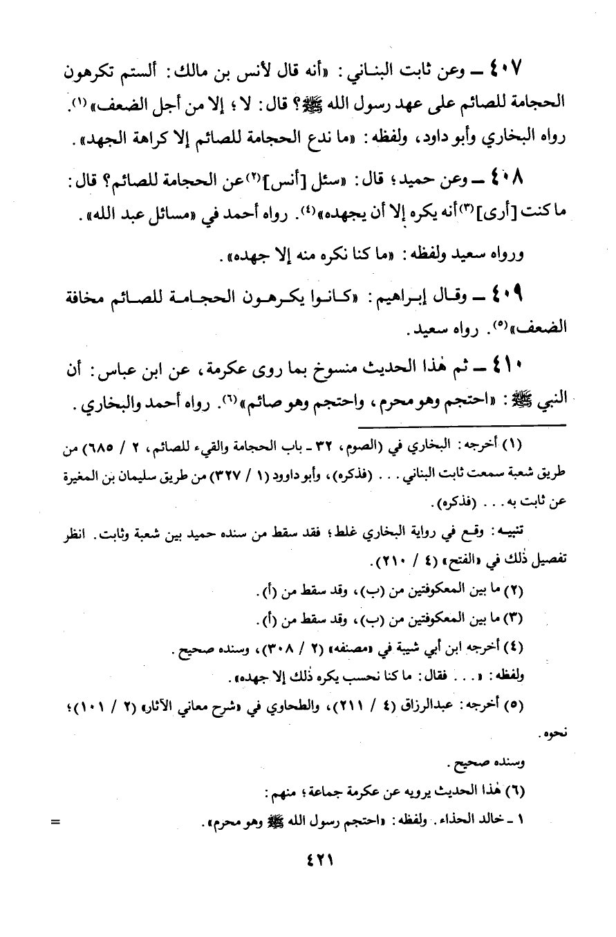 410 - ثم هذا الحديث منسوخ بما روى عكرمة, عن ابن عباس: أن النبي صلى الله عليه وسلم: «احتجم وهو محرم, واحتجم وهو صائم». رواه أحمد والبخاري.