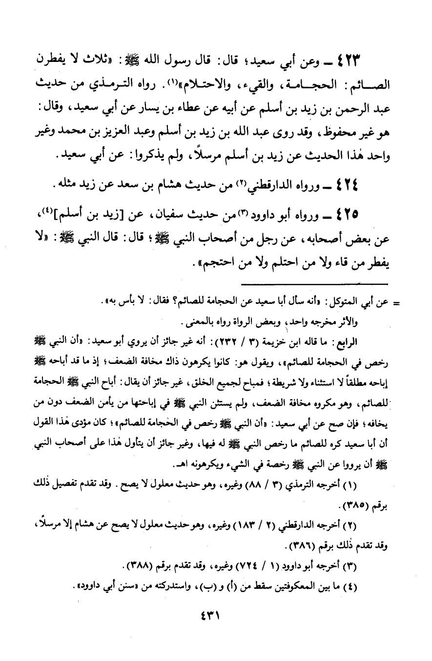 425 - ورواه أبو داوود من حديث سفيان, عن [زيد بن أسلم] , عن بعض أصحابه, عن رجل من أصحاب النبي صلى الله عليه وسلم؛ قال: قال النبي صلى الله عليه وسلم: «لا يفطر من قاء ولا من احتلم ولا من احتجم».