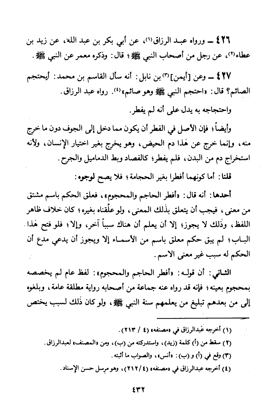 427 - وعن [أيمن] بن نابل: أنه سأل القاسم بن محمد: أيحتجم الصائم؟ قال: «احتجم النبي صلى الله عليه وسلم وهو صائم». رواه عبد الرزاق.