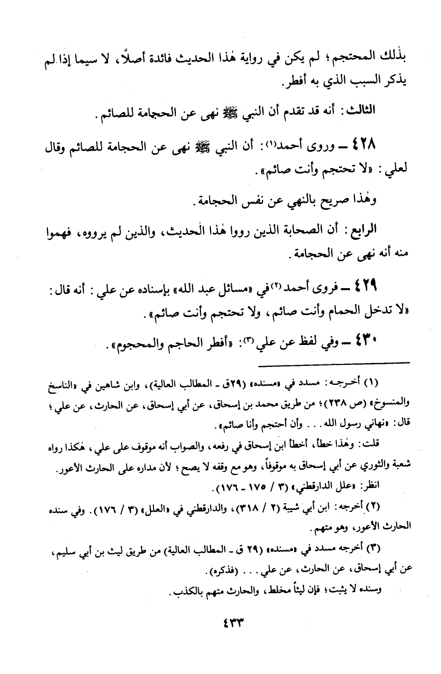 429 - فروى أحمد في «مسائل عبد الله» بإسناده عن علي: أنه قال: «لا تدخل الحمام وأنت صائم, ولا تحتجم وأنت صائم».