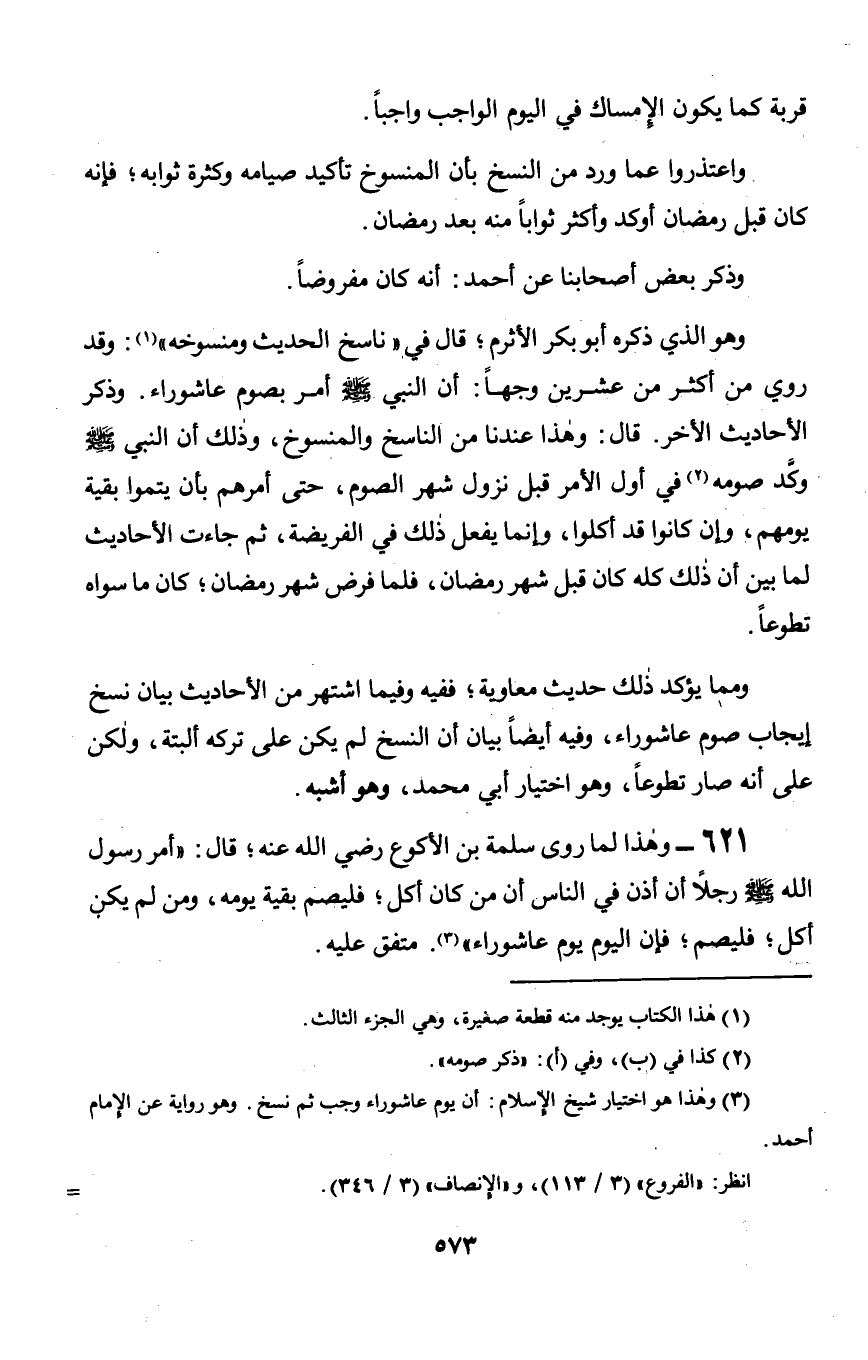 621 - وهذا لما روى سلمة بن الأكوع رضي الله عنه؛ قال: «أمر رسول الله صلى الله عليه وسلم رجلاً أن أذن في الناس أن من كان أكل؛ فليصم بقية يومه, ومن لم يكن أكل؛ فليصم؛ فإن اليوم يوم عاشوراء». متفق عليه.