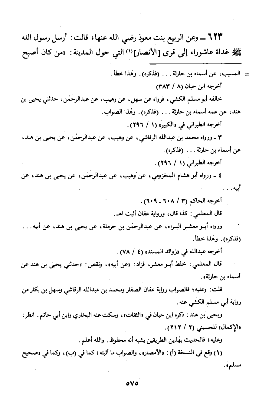 623 - وعن الربيع بنت معوذ رضي الله عنها؛ قالت: أرسل رسول الله صلى الله عليه وسلم غداة عاشوراء إلى قرى [الأنصار] التي حول المدينة: «من كان أصبح