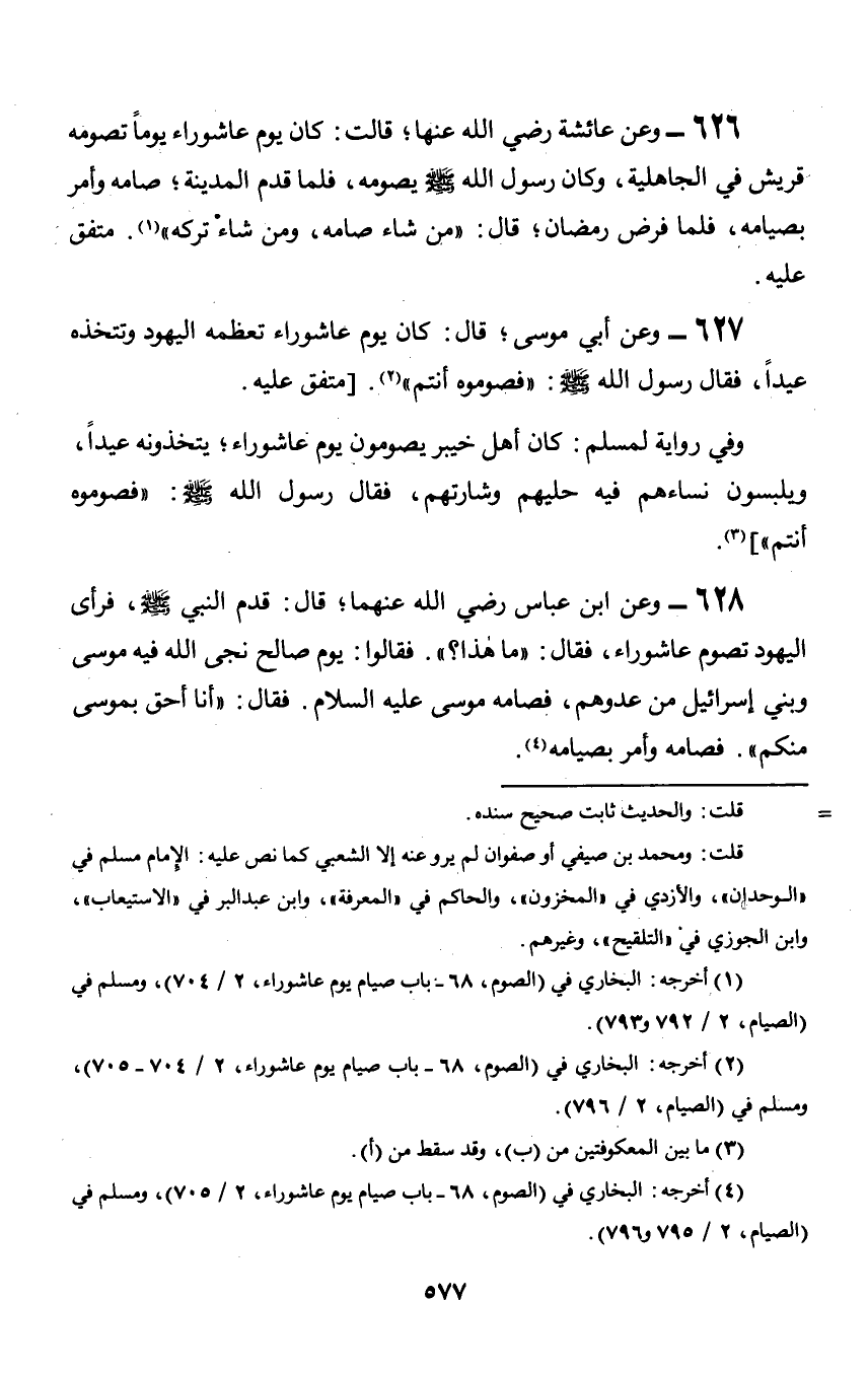 627 - وعن أبي موسى؛ قال: كان يوم عاشوراء تعظمه اليهود وتتخذه عيداً, فقال رسول الله صلى الله عليه وسلم: «فصوموه أنتم». [متفق عليه.