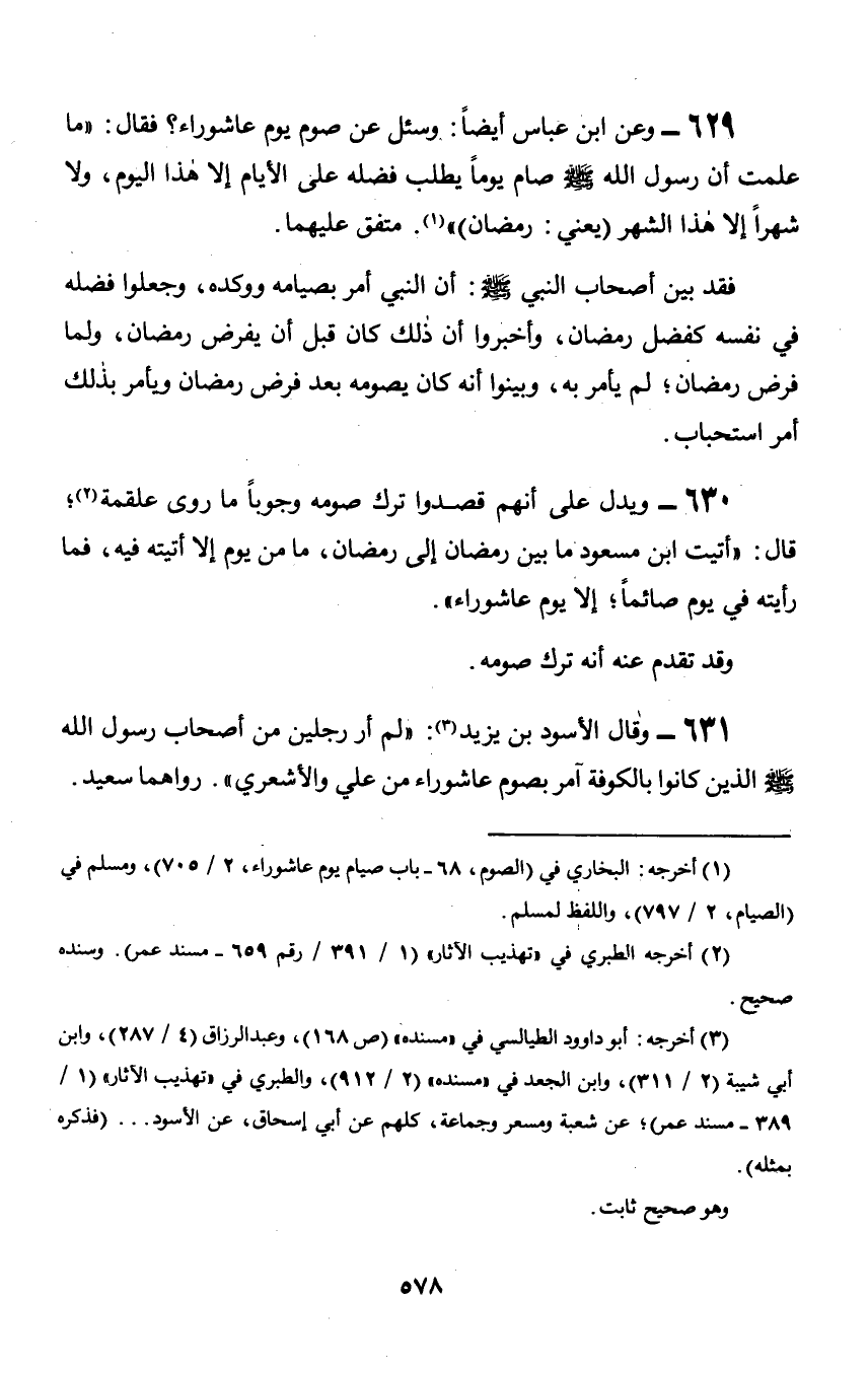 631 - وقال الأسود بن يزيد: «لم أر رجلين من أصحاب رسول الله صلى الله عليه وسلم الذين كانوا بالكوفة آمر بصوم عاشوراء من علي والأشعري». رواهما سعيد.